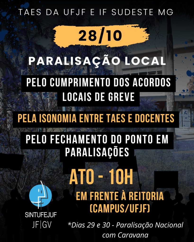 O SINTUFEJUF convoca todas as trabalhadoras e todos os trabalhadores técnico-administrativos em educação da UFJF para o ato público no dia 28 de outubro, data de paralisação local da categoria.