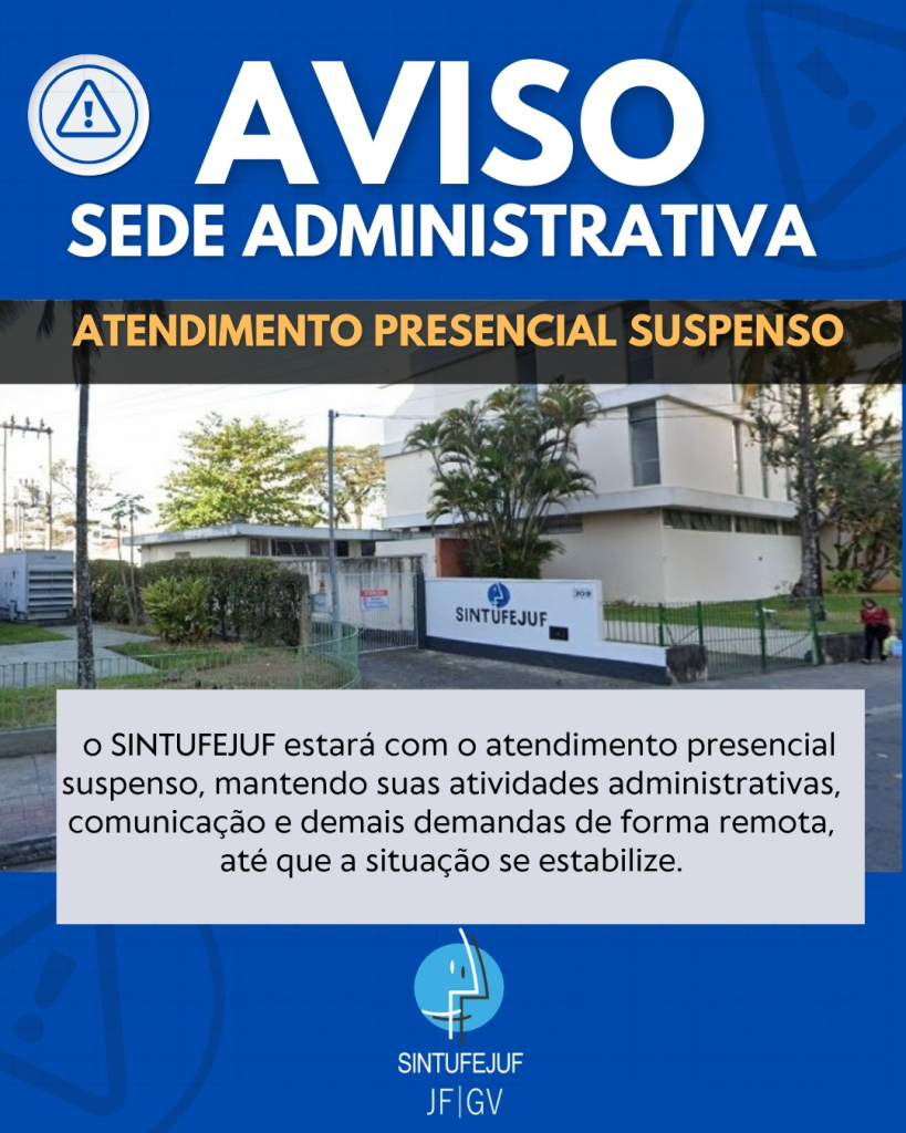 Diante dessa situação, o SINTUFEJUF estará com o atendimento presencial suspenso 🚫, mantendo suas atividades administrativas, comunicação e demais demandas de forma remota 💻 até que a situação se estabilize.
