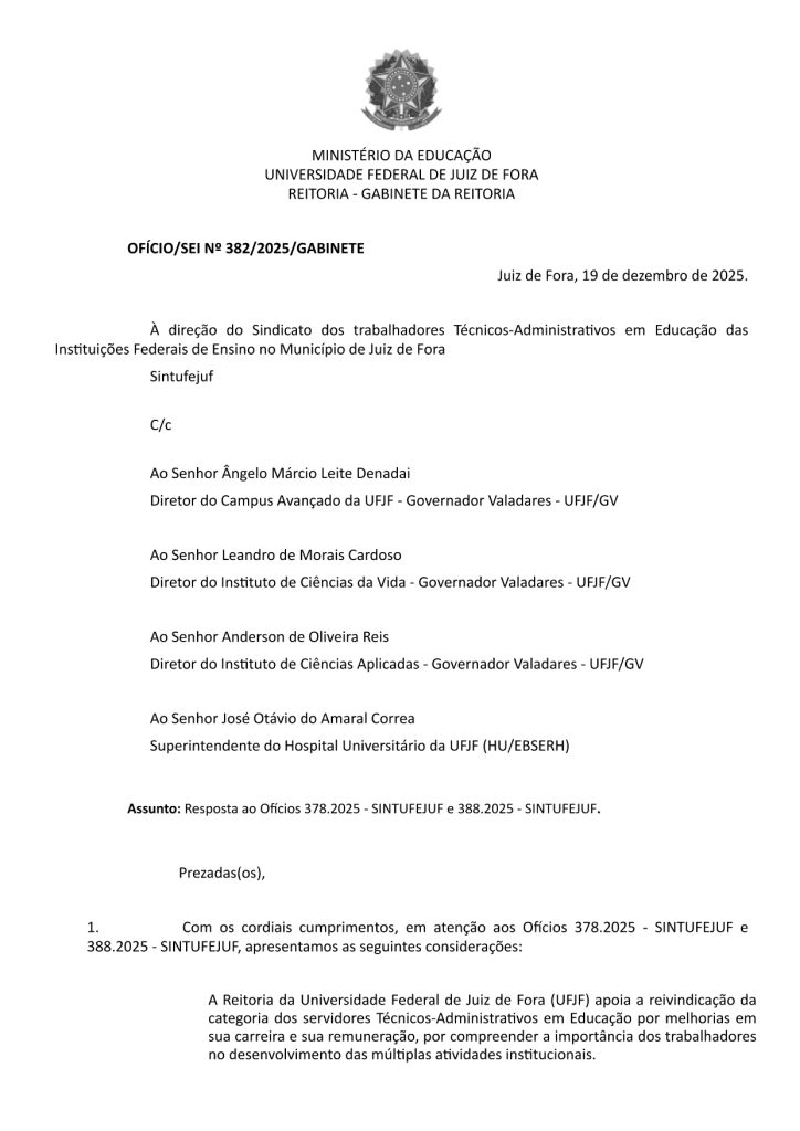 A Administração Superior da UFJF respondeu à solicitação encaminhada pela categoria dos Técnico-Administrativos em Educação (TAEs), conforme deliberação aprovada em Assembleia Geral.