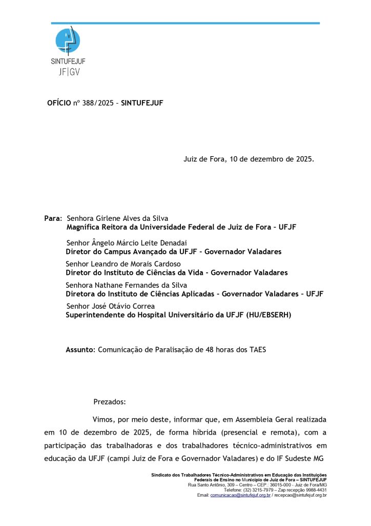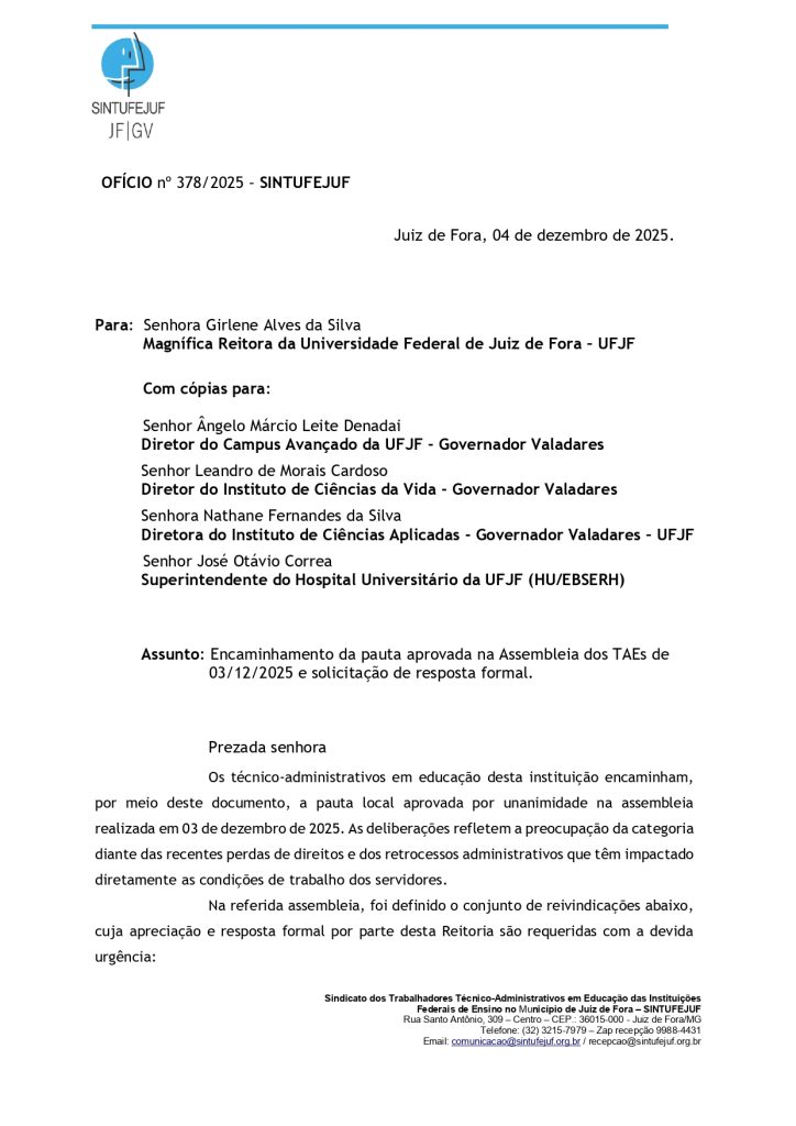 Atendendo ao pedido, o SINTUFEJUF solicitou que os esclarecimentos apresentados pelo coordenador, Rogério da Silva, fossem formalizados por meio de e-mail institucional, a ser enviado pela Reitoria ao sindicato. Diante disso, a Administração Superior convocou a diretoria do SINTUFEJUF no dia 19 de dezembro de 2025, para uma reunião às 11h do mesmo dia.