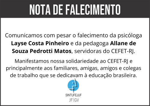 O SINTUFEJUF lamenta a notícia da morte da psicóloga Layse Costa Pinheiro e da pedagoga Allane de Souza Pedrotti Matos, servidoras do CEFET-RJ, assassinadas na última sexta-feira, dia 28, na unidade Maracanã do Centro Federal de Educação Tecnológica Celso Suckow da Fonseca, no Rio de Janeiro.