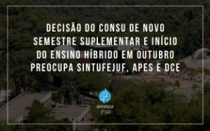 setembro 14, 2021Decisão do CONSU de novo semestre suplementar e início do ensino híbrido em outubro preocupa SINTUFEJUF, APES e DCE. Decisão do CONSU
