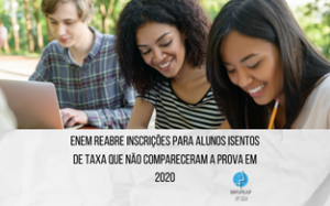 setembro 24, 2021ENEM reabre inscrições para alunos isentos de taxa que não compareceram a prova em 2020 Alunos que não puderam comparecer por conta da pandemia ou qualquer outra razão podem se inscrever gratuitamente