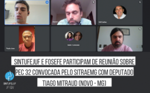 agosto 24, 2021SINTUFEJUF e FOSEFE participam de reunião sobre PEC 32 convocada pelo SITRAEMG com deputado Tiago Mitraud (Novo – MG) PEC pode chegar ao Plenário ainda este mês