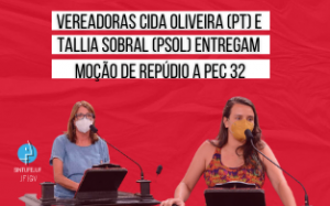 agosto 25, 2021Vereadoras Cida Oliveira (PT) e Tallia Sobral (PSOL) entregam moção de repúdio a PEC 32 PEC visa corte de direitos e sucateamento do serviço público