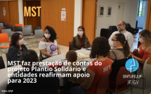 dezembro 22, 2022MST faz prestação de contas do projeto Plantio Solidário e entidades reafirmam apoio para 2023 Ação impactou mais de 55 famílias em cinco bairros periféricos de Juiz de Fora e doou uma tonelada de alimentos