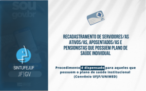 outubro 26, 2022Termina segunda, 31, o prazo de recadastramento de servidores/as ativos/as, aposentados/as e pensionistas que possuem plano de saúde individual Procedimento é dispensado para aqueles que possuem o plano de saúde institucional (Convênio UFJF/UNIMED)