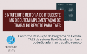 julho 29, 2022SINTUFEJUF e reitoria do IF Sudeste MG discutem implementação de Trabalho Remoto para TAEs Conforme Resolução do Programa de Gestão, TAES de setores flexibilizados também poderão aderir ao trabalho remoto