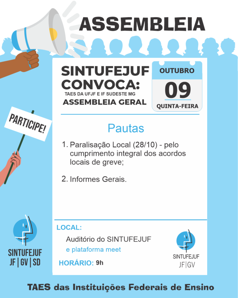 O SINTUFEJUF convoca a categoria de trabalhadores técnico-administrativos em educação da UFJF e IF Sudeste MG para Assembleia Geral híbrida, que acontecerá na quinta-feira, 09 de outubro de 2025, às 9h, no auditório do SINTUFEJUF e pela plataforma meet, para debater e deliberar sobre as seguintes pautas: