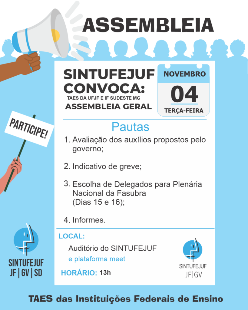 O SINTUFEJUF convoca a categoria de trabalhadores técnico-administrativos em educação da UFJF e IF Sudeste MG para Assembleia Geral híbrida, que acontecerá na terça-feira, 04 de novembro de 2025, às 13h, no auditório do SINTUFEJUF e pela plataforma meet, para debater e deliberar sobre as seguintes pautas: