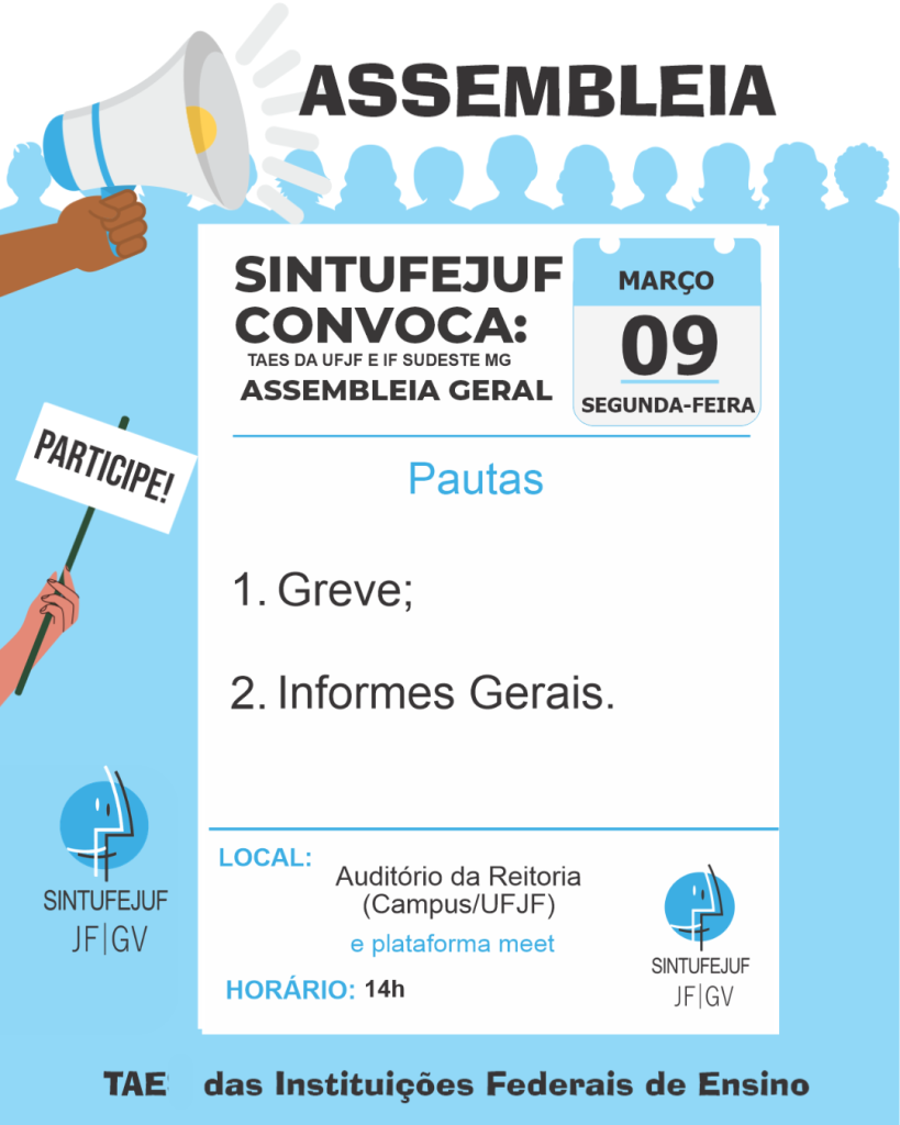 O SINTUFEJUF convoca a categoria de trabalhadores técnico-administrativos em educação da UFJF (campus de Juiz de Fora e Governador Valadares) e IF Sudeste MG (campus de Juiz de Fora, Santos Dumont e Reitoria) para Assembleia Geral híbrida, que acontecerá na segunda-feira, 09 de março de 2026, às 14h, no Auditório da Reitoria (Campus/UFJF) e pela plataforma meet, para debater e deliberar sobre as seguintes pautas: