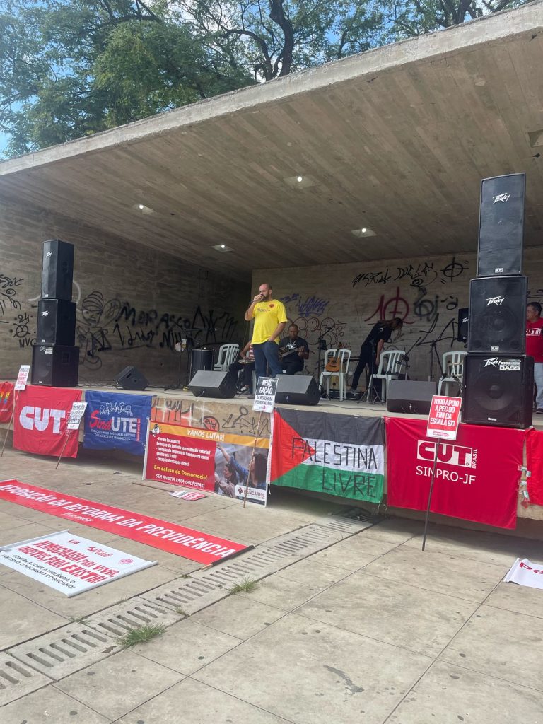 Durante as falas, diretores do SINTUFEJUF e demais lideranças sindicais destacaram reivindicações importantes da classe trabalhadora, como o fim da escala 6×1, a redução da jornada de trabalho sem redução salarial, a isenção do Imposto de Renda para quem ganha até R$ 5 mil e a taxação dos super-ricos.