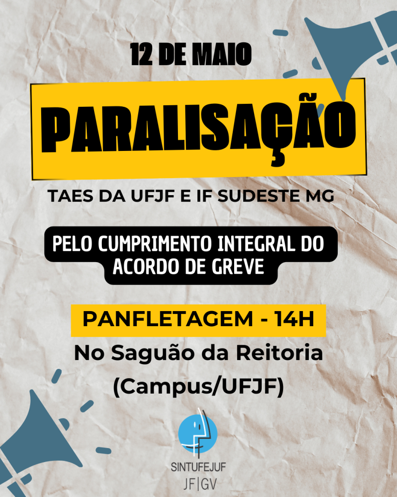 óxima segunda-feira, 12 de maio, as trabalhadoras e trabalhadores técnico-administrativos em educação (TAEs) da Universidade Federal de Juiz de Fora (UFJF) e do Instituto Federal do Sudeste de Minas Gerais (IF Sudeste MG) irão paralisar as atividades acompanhando a mobilização nacional convocada pela FASUBRA Sindical. A paralisação ocorre no mesmo dia em que será instalada a Mesa Setorial de Negociação com o Ministério da Educação (MEC), marcada por pressão da categoria.